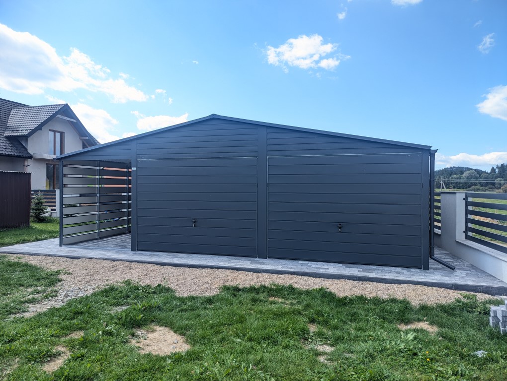 Przedstawiamy nowoczesny garaż dwustanowiskowy z wiatą, utrzymany w eleganckim kolorze grafitowym (antracyt). To połączenie praktyczności, estetyki i solidnego wykonania – idealne dla osób, które cenią funkcjonalne rozwiązania i nowoczesny wygląd posesji.
