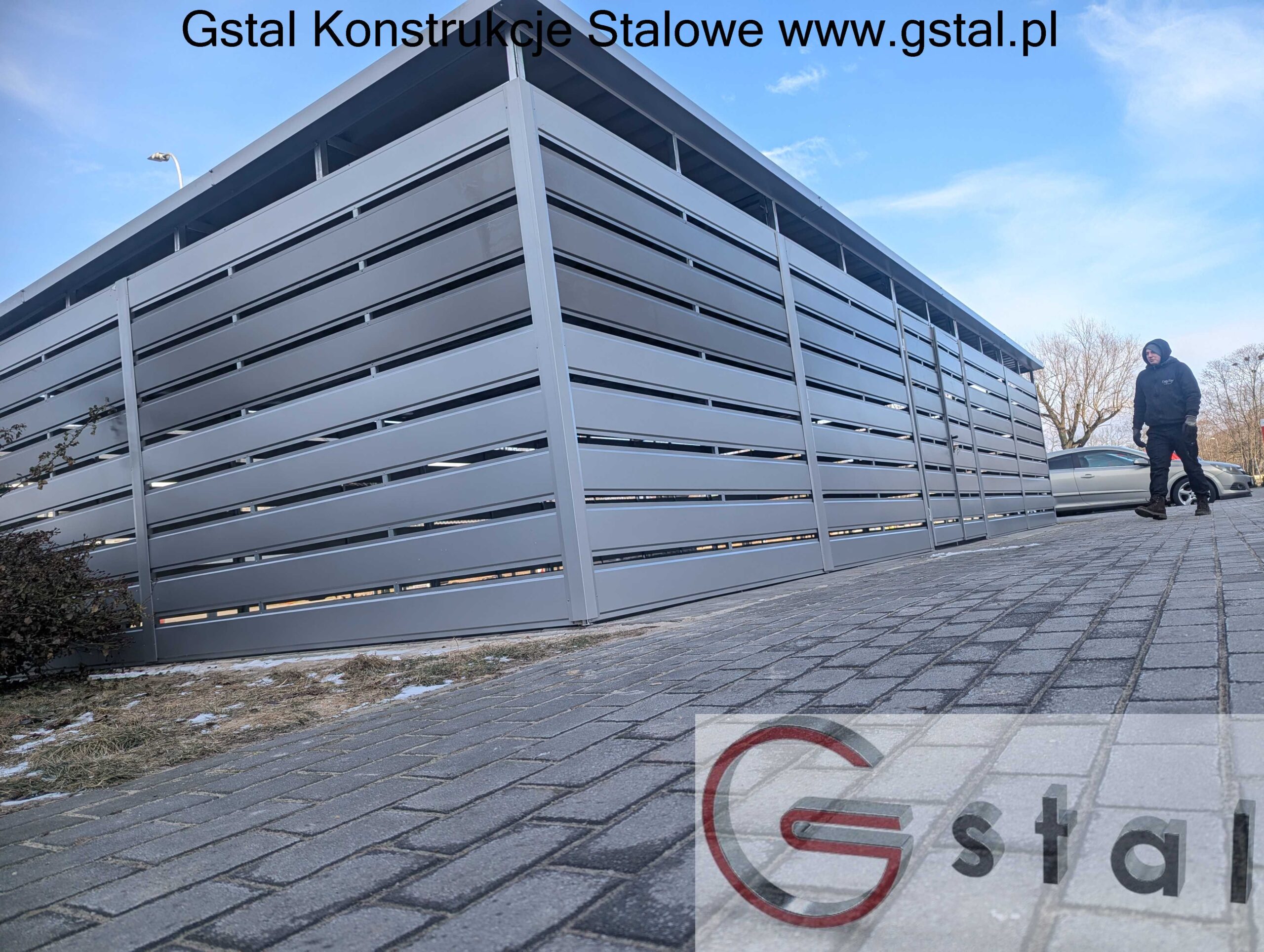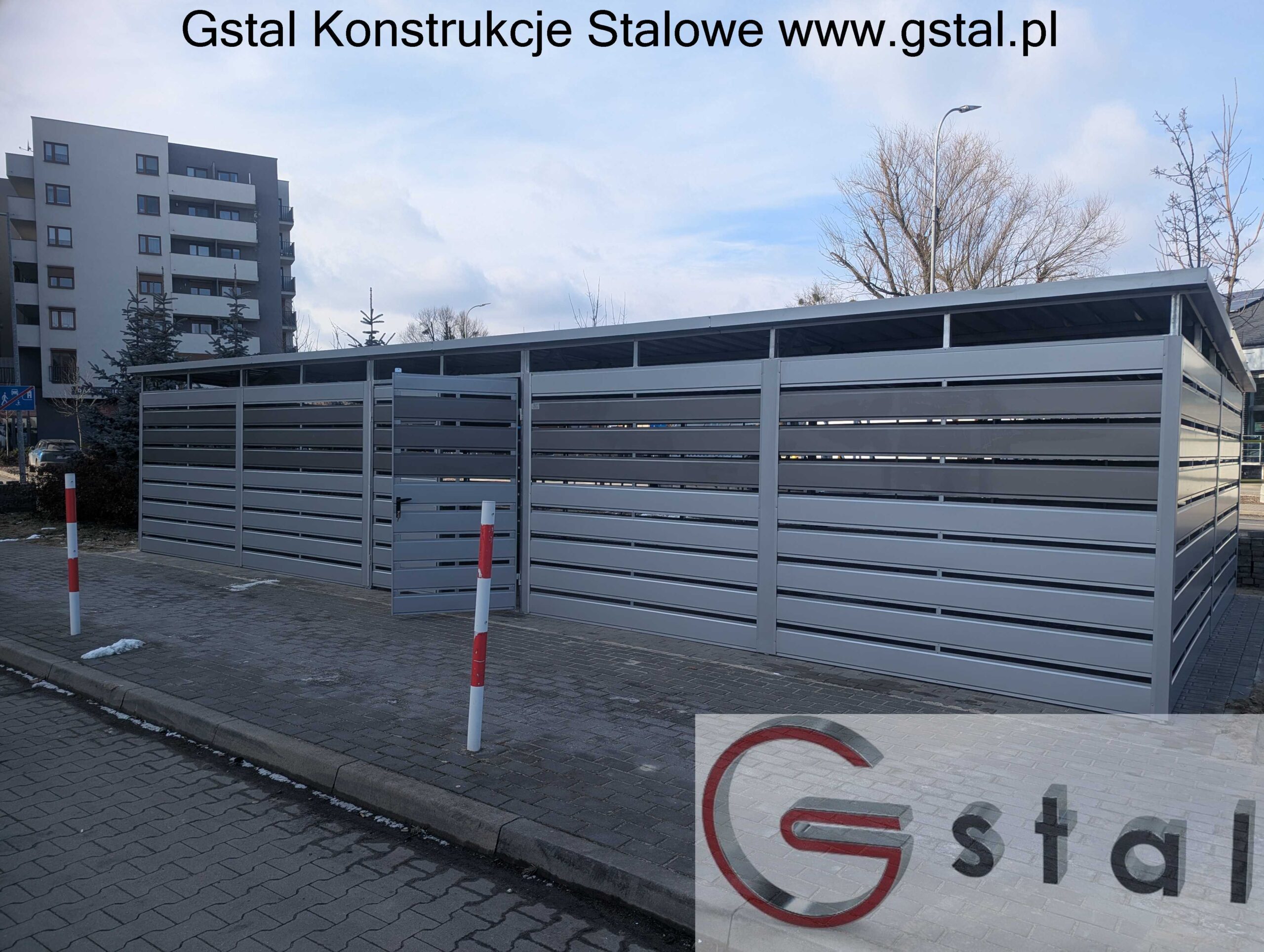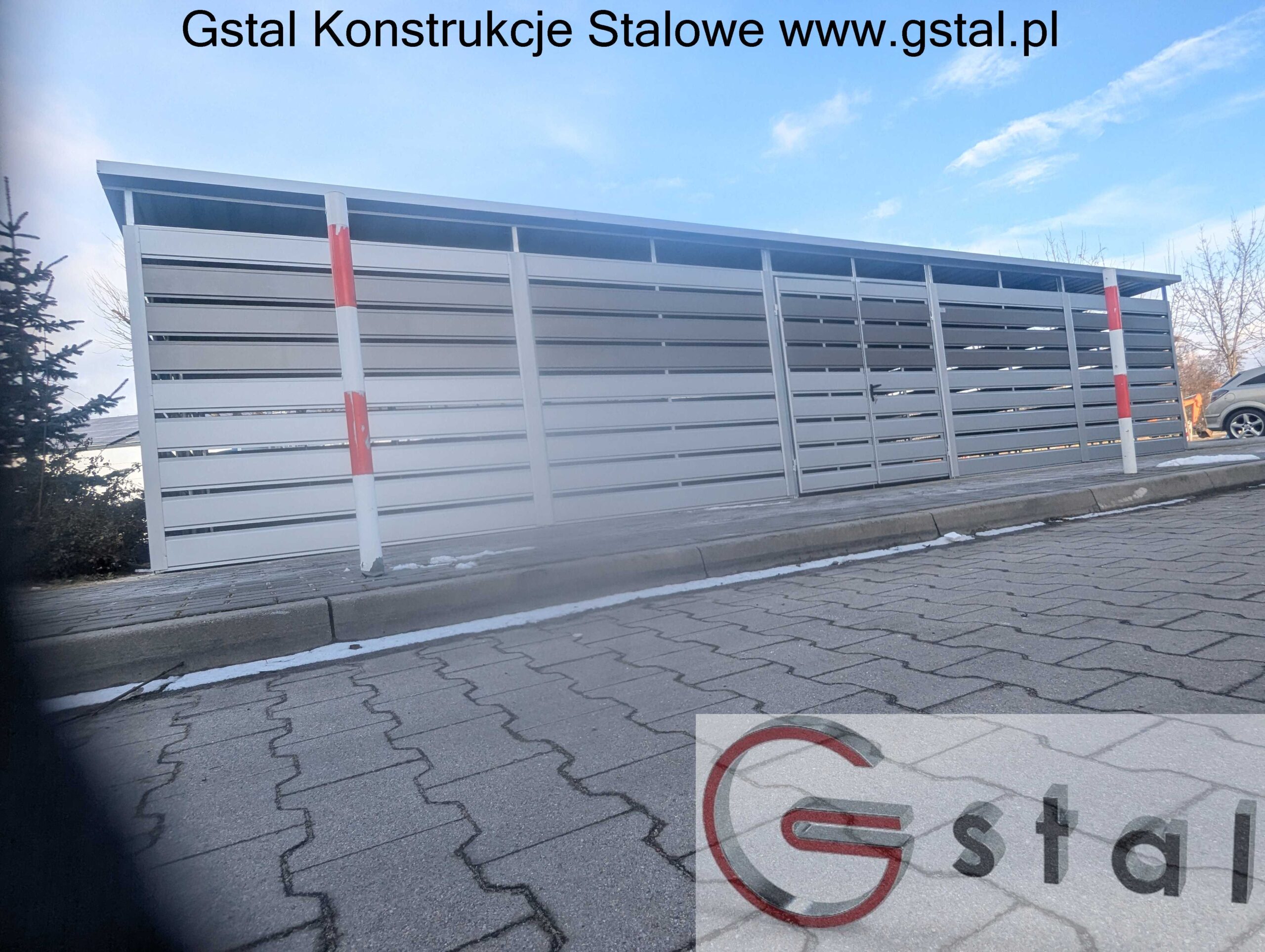 Konstrukcja wiaty opiera się na solidnym stalowym szkielecie. Ściany boczne oraz frontowe wykonane są z poziomych, szerokich paneli, z których dolna część jest w kolorze jasno szarym RAL 9006, a górna część wypełniona jest ciemniejszymi  panelami w kolorze ciemno szarym RAL 9007. Te ciemniejsze pasy sprawiają, że wiata idealnie wtapia się w otoczenie na nowoczesnych osiedlach.
